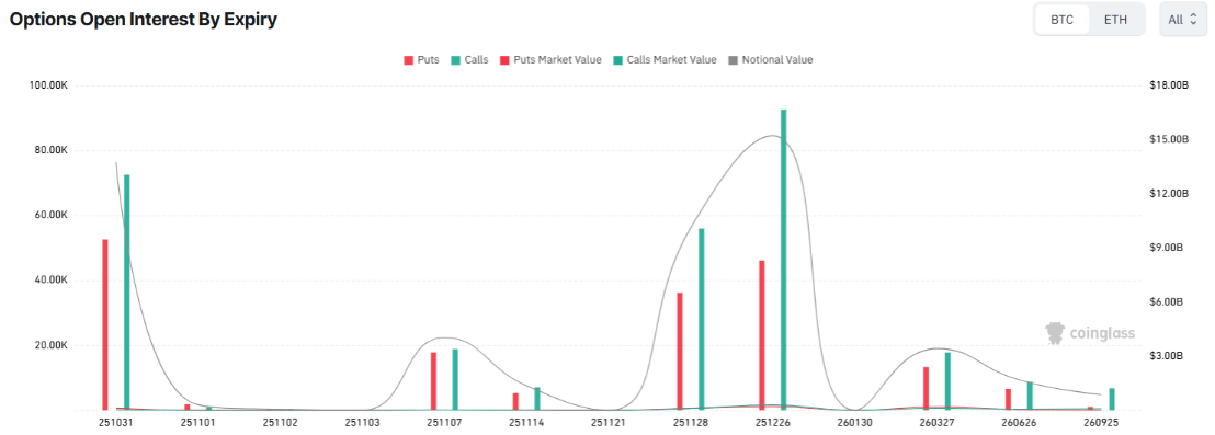 The expiry includes 124,171 Bitcoin contracts worth $13.59 billion and 646,902 Ethereum contracts totaling $2.49 billion. This surpasses last week’s $6 billion event due to the monthly rollover of October contracts.