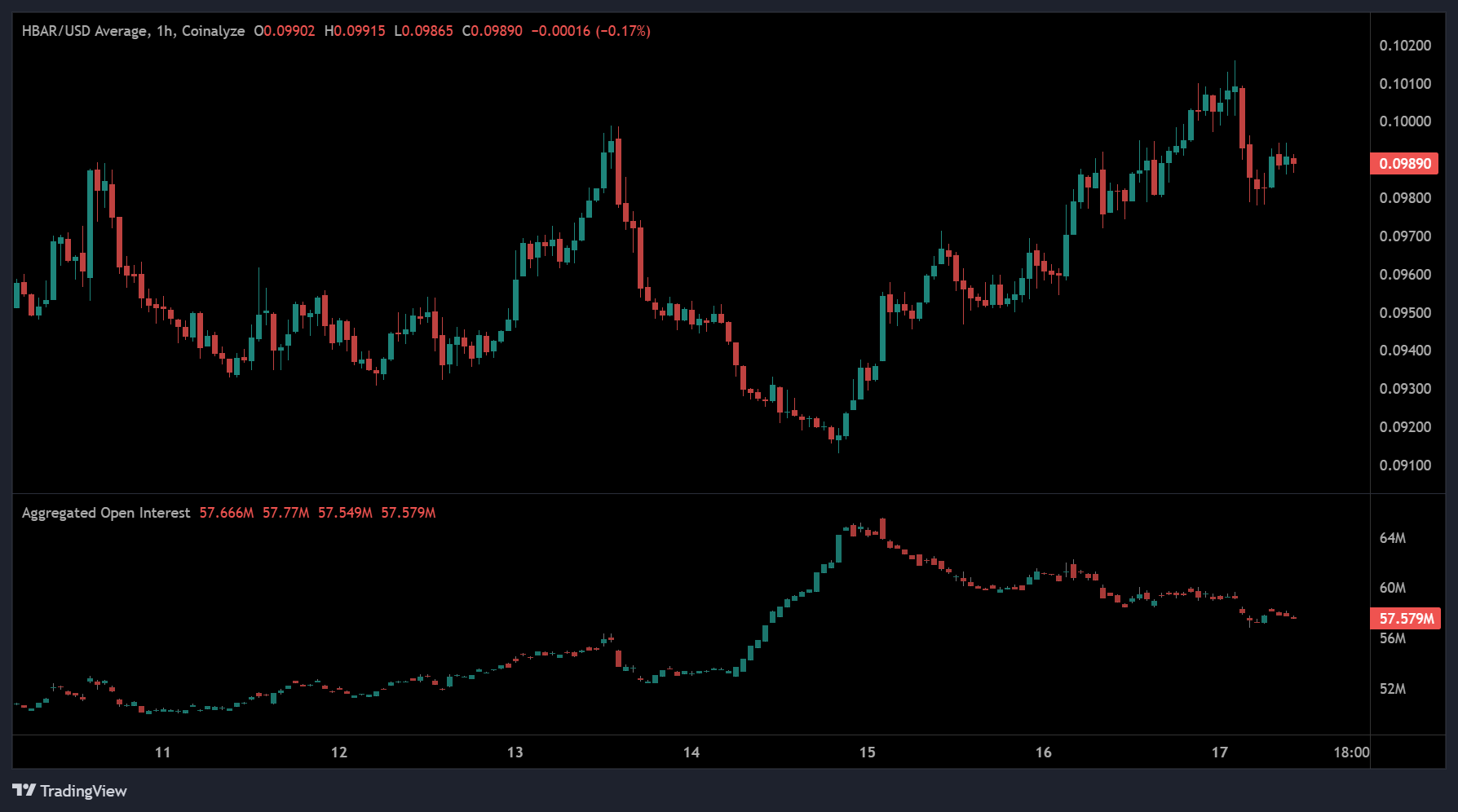 Open interest analytics data indicate that Hedera has traded at $0.09890 following a minor decrease of 0.17% per hour. The chart indicates short-term up peaks; however, the price is not changing by a large amount, with the range being between $0.091 and $0.102.