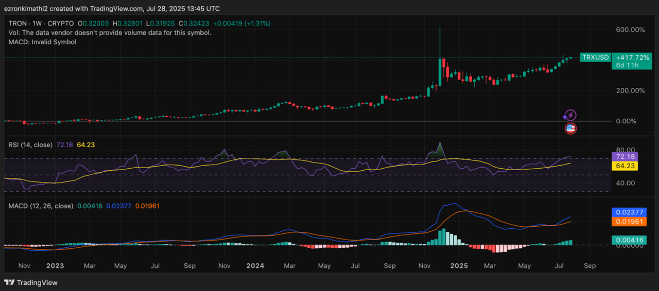 TRON (TRX) climbed past $0.32 following its Nasdaq listing through a reverse merger valued at $100 million. The listing occurred on July 24 and has served as the main driver behind the latest price increase. Analysts have observed that TRON’s exposure to the public equity market may support new funding opportunities and strategic partnerships. Technical indicators also show a bullish trend, with the Relative Strength Index at 72.18 and price nearing resistance at $0.33.