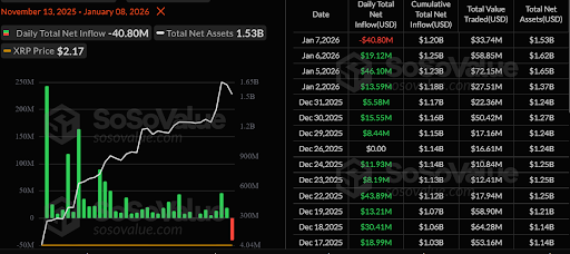 According to SoSoValue data, on Wednesday, the U.S. spot XRP Exchange fund saw around $40.8 million flows in negative, after a multi-week period of inflows without any interruption.