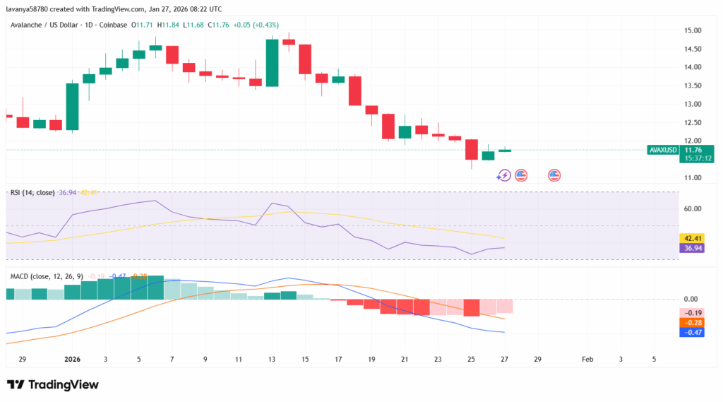 AVAX is trading around the $11.50-$12.00 support zone, and the overall trend is staying bearish as prices continue to create lower highs and lower lows.