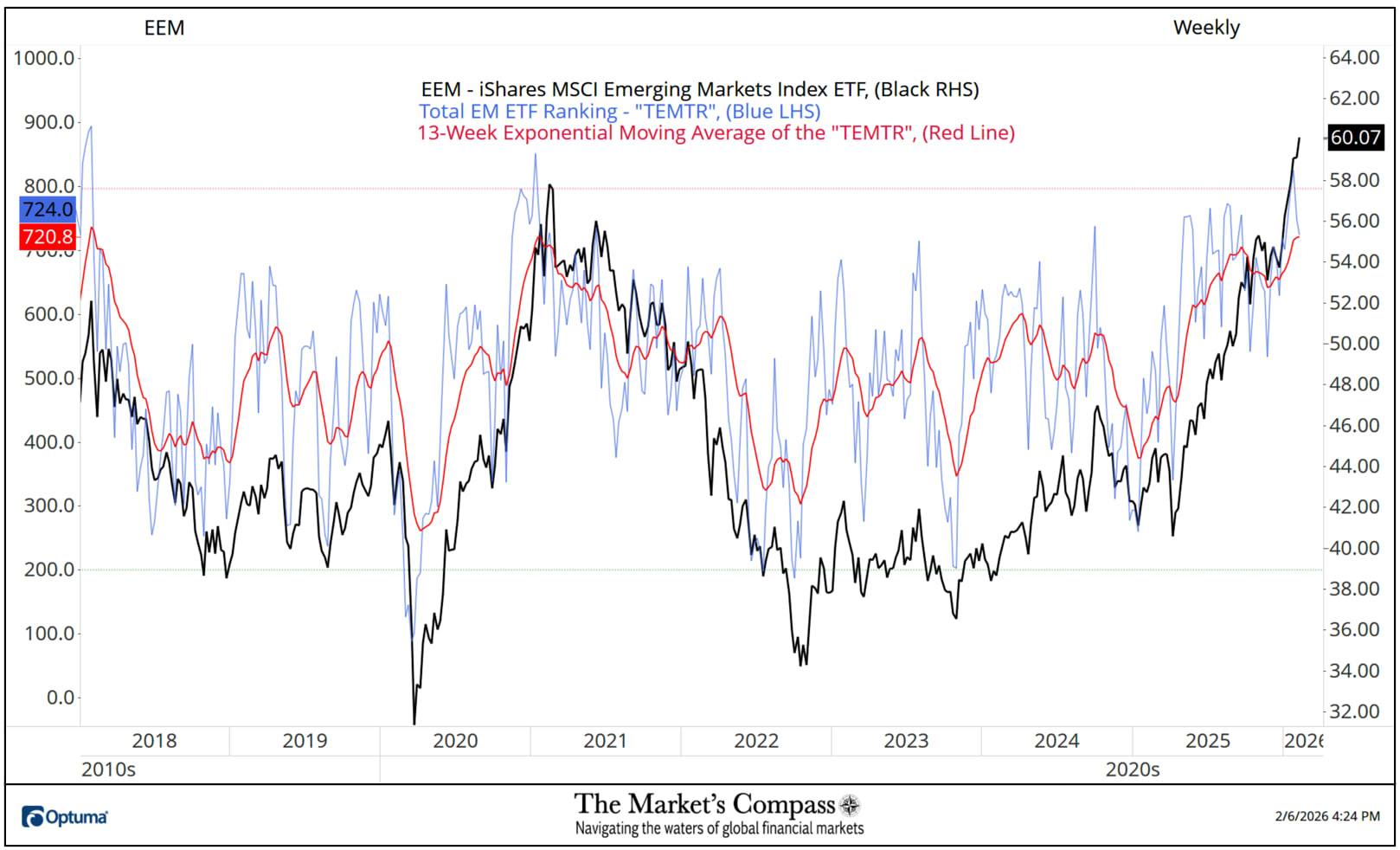*The “TEMTR” is the sum of the 20 Individual Objective EM ETF Technical Rankings. It serves as an overbought or oversold as well as a confirmation / non-confirmation indicator.