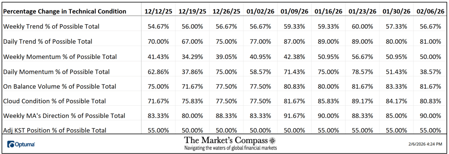 This past week a reading of 38.57% was registered in the Daily Momentum Technical Condition Factor (”DMTCF”) or 54 out of a possible total of 140 positive points.