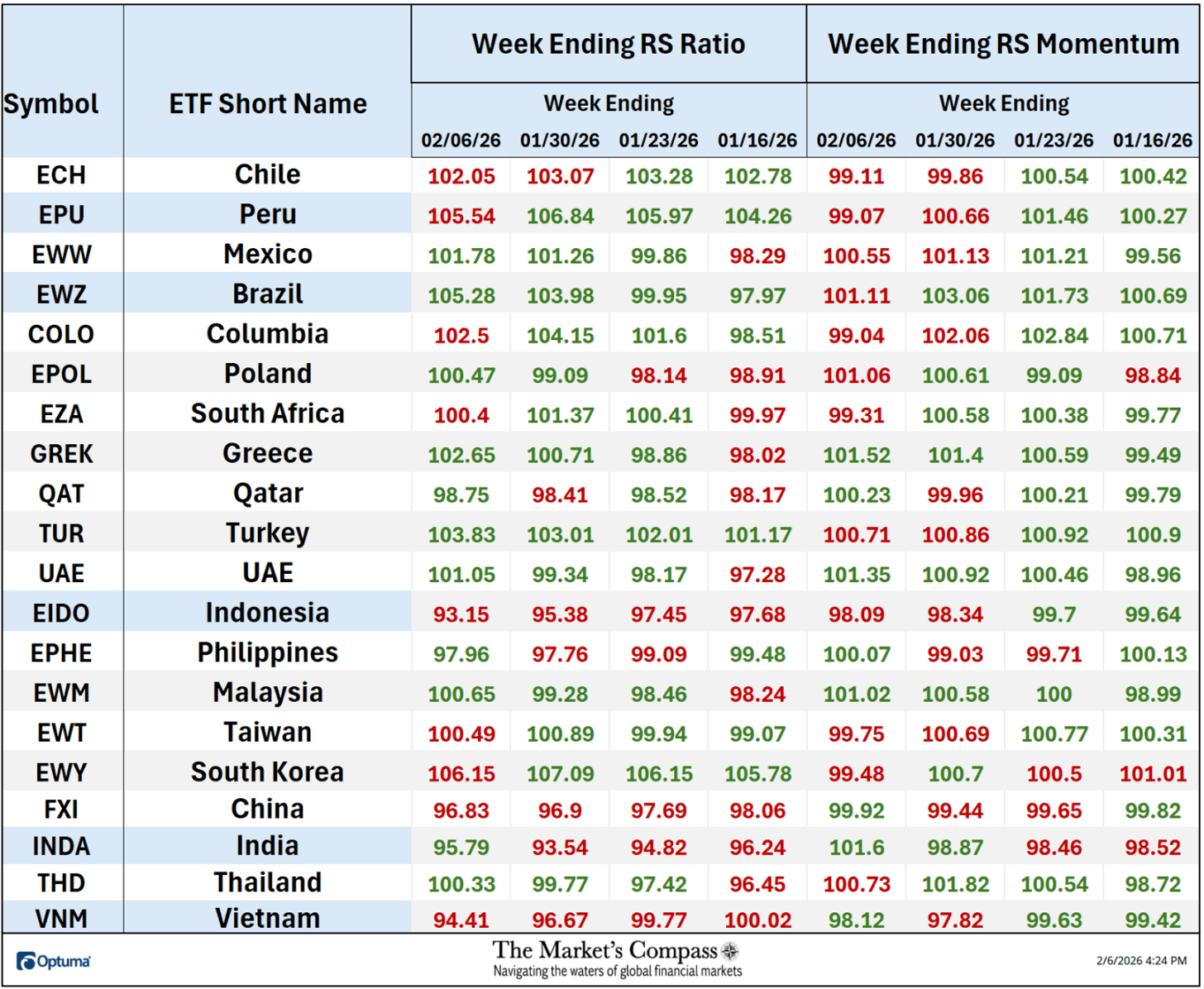 The “Tabulation Table” below marks the Relative Strength and Relative Strength Momentum readings vs. the iShares MSCI Emerging Markets Index ETF or EEM. It begins with the readings at the end of last week followed by the trailing three weeks that includes the readings from the last Study for the week ending 1/16. If there has been an improvement in either the Relative Strength Ratio or the Relative Strength Momentum reading on a week-over-week basis I have highlighted it in green. If there has been a contraction in either, it is highlighted in red and an unchanged reading in either will remain black. The color-coding system serves as a heat map over the past four Friday’s readings highlighting either the continued improvement, deterioration, or stasis vs. the benchmark, the EEM. The ETFs that are displayed on the RRG chart above are highlighted in blue.