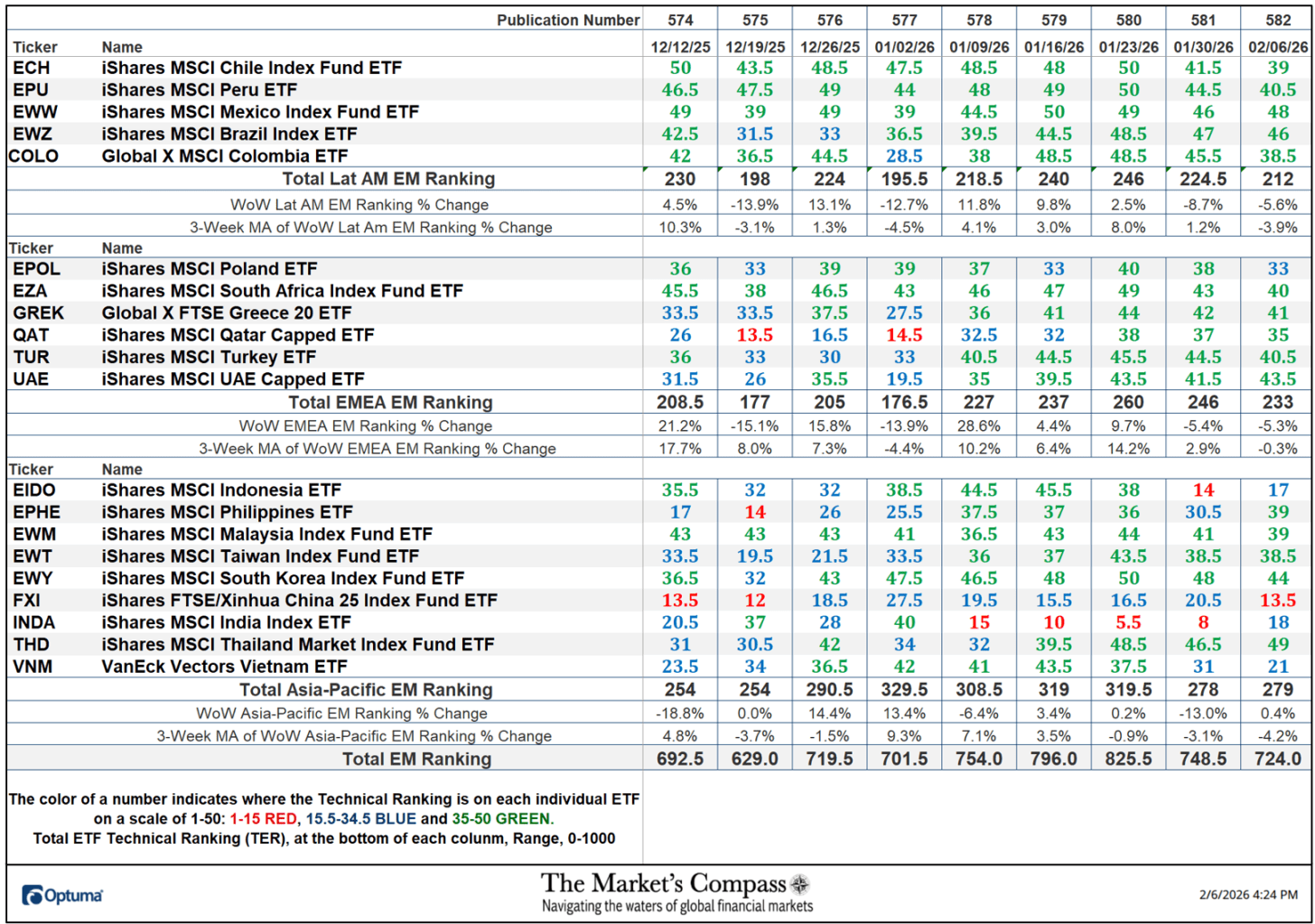 To understand the methodology used in constructing the objective EM Country ETF Individual Technical Rankings visit the mc’s technical indicators page at www.themarketscompass.com and select “em country etfs”. What follows is a Cliff Notes version* of the full explanation of the methodology I use…