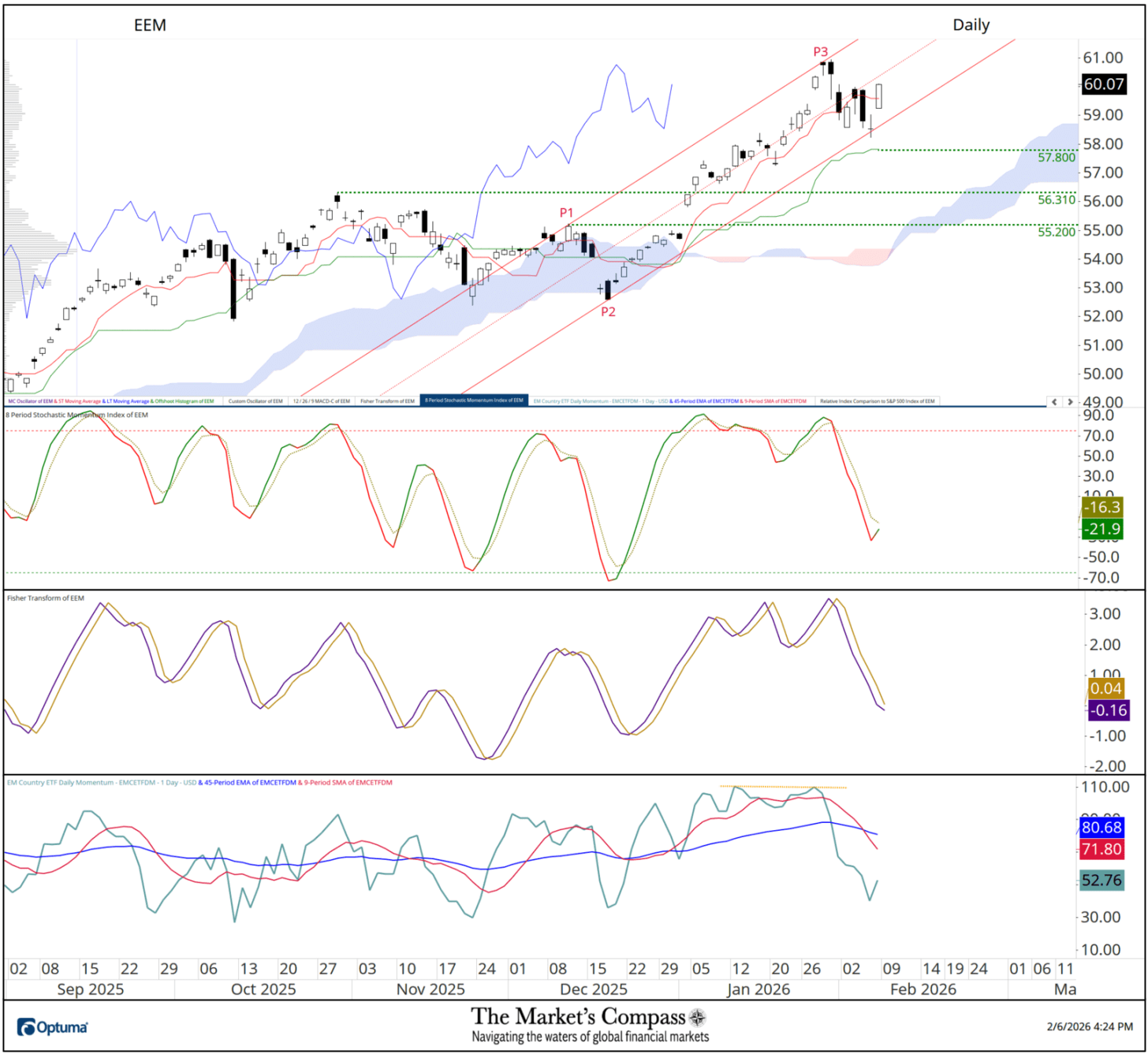 In the previous Emerging Markets Country ETF Study (published on January 19th), I suggested that “a retracement is forthcoming in the short term which is hardly a surprise considering how stretched the EEM has become”. That technical thesis proved to be premature and the EEM rallied to new highs but a week ago, last Thursday the chickens finally came home to roost. When it became evident that the retracement was unfolding last last week I added a new Schiff Modified Pitchfork (red P1 through P3). The EM Country ETF Daily Momentum / Breadth Oscillator failed to confirm the highs at P3 (yellow dashed line in the lower panel) giving me confidence that the backing and filling was about to unfold. Last Thursday the Lower Parallel (solid red line) offered a measure of price support leading to Friday’s rally. That rally led to a slowing of the decline in both the Stochastic Momentum Index and the Fisher Transform* although both remain below their signal lines. Only a follow through to Friday’s price rally through the Median Line (red dotted line) of the newly drawn Pitchfork would suggest that the price pullback may have run its course. Key word “may”.