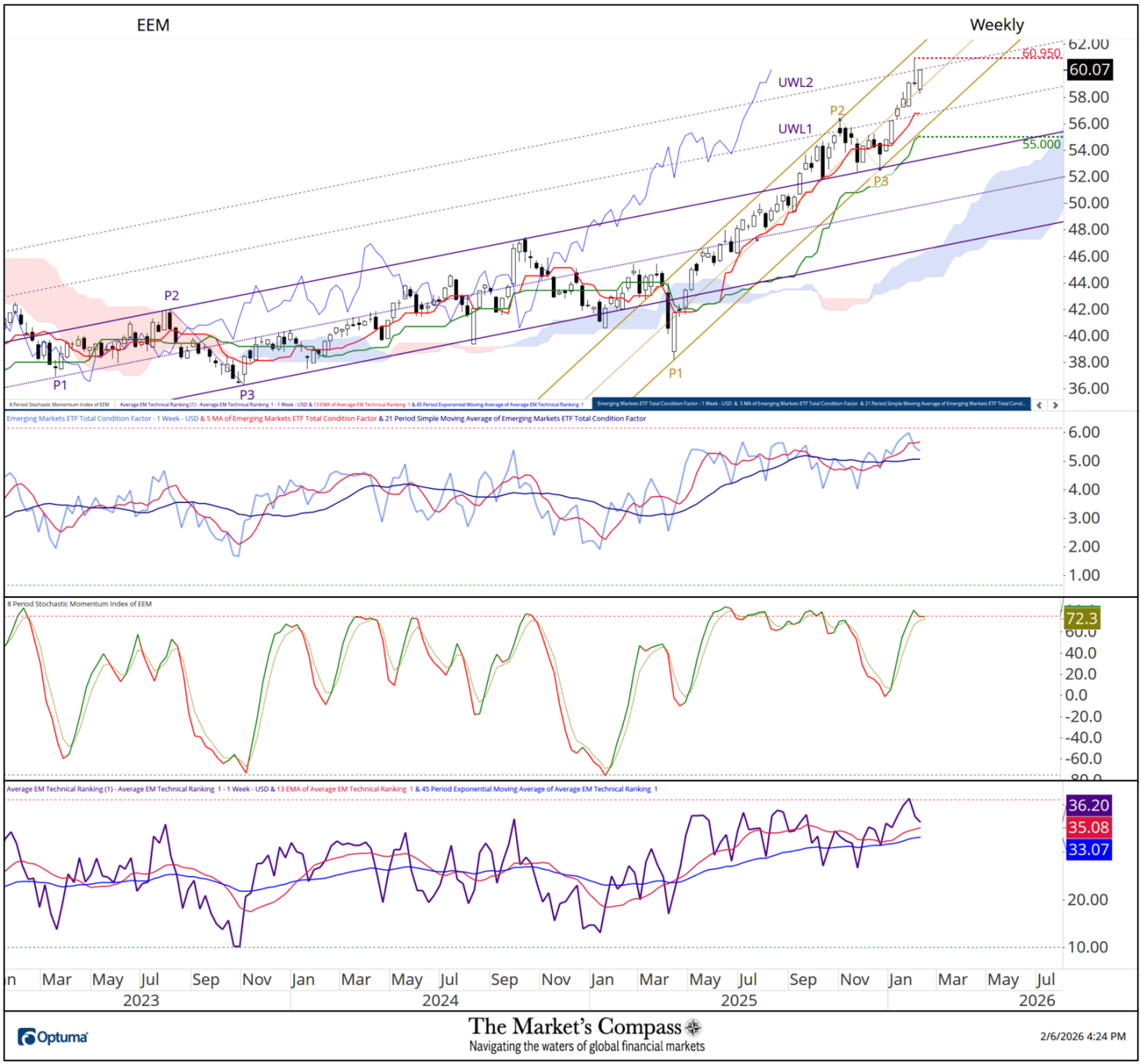 As I pointed out in comments on the Weekly Line Chart, two weeks ago the EEM rose to an all-time intra-week high at 60.95 but failed to hold above Upper Warning Line 2 (violet dotted line) of the longer-term Standard Pitchfork (violet P1-P3) and prices closed near the at the lows of the week. Last week prices opened lower but reversed and advanced back above the Median Line (gold dotted line) of the shorter-term Schiff Modified Pitchfork (gold dotted line) but was capped at the UWL2 at the close of the week. The Emerging Markets Total Condition Factor Oscillator has pulled back for the second week in a row from overbought territory and has fallen below the 5-Week Movin Average (red line) The Average EM Technical Ranking (bottom panel) has done the same although it remains above both Moving Averages.