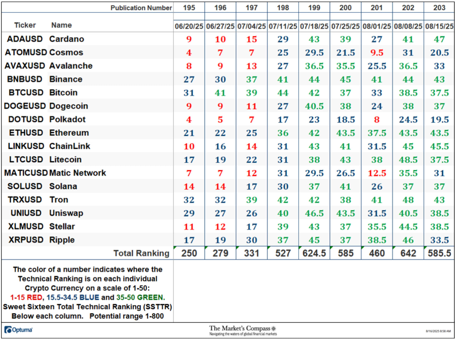 An explanation of my objective Individual Technical Rankings and Sweet Sixteen Total Technical Ranking go to www.themarketscompass.com. Then go to the MC’s Technical Indicators and select “crypto sweet 16”. What follows is a Cliff Notes version* of the full explanation…