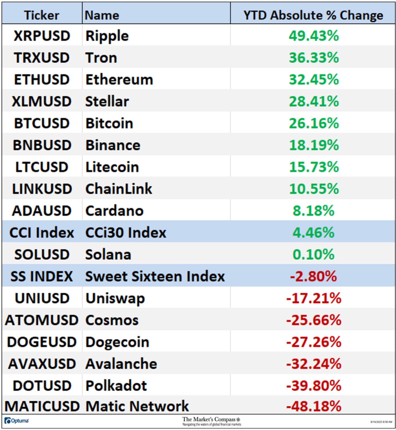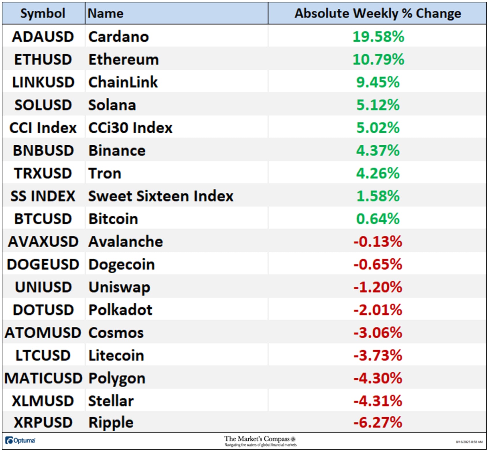 Welcome to this week’s publication of the Market’s Compass Crypto Sweet Sixteen Study #203. The Study tracks the technical condition of sixteen of the larger market cap cryptocurrencies. Every week* the Studies will highlight the technical changes of the 16 cryptocurrencies that I track as well as highlights on noteworthy moves in individual Cryptocurrencies and Indexes. As always, paid subscribers will receive this week’s unabridged Market’s Compass Crypto Sweet Sixteen Study sent to their registered email. Past publications including the Weekly ETF Studies can be accessed by paid subscribers via The Market’s Compass Substack Blog.