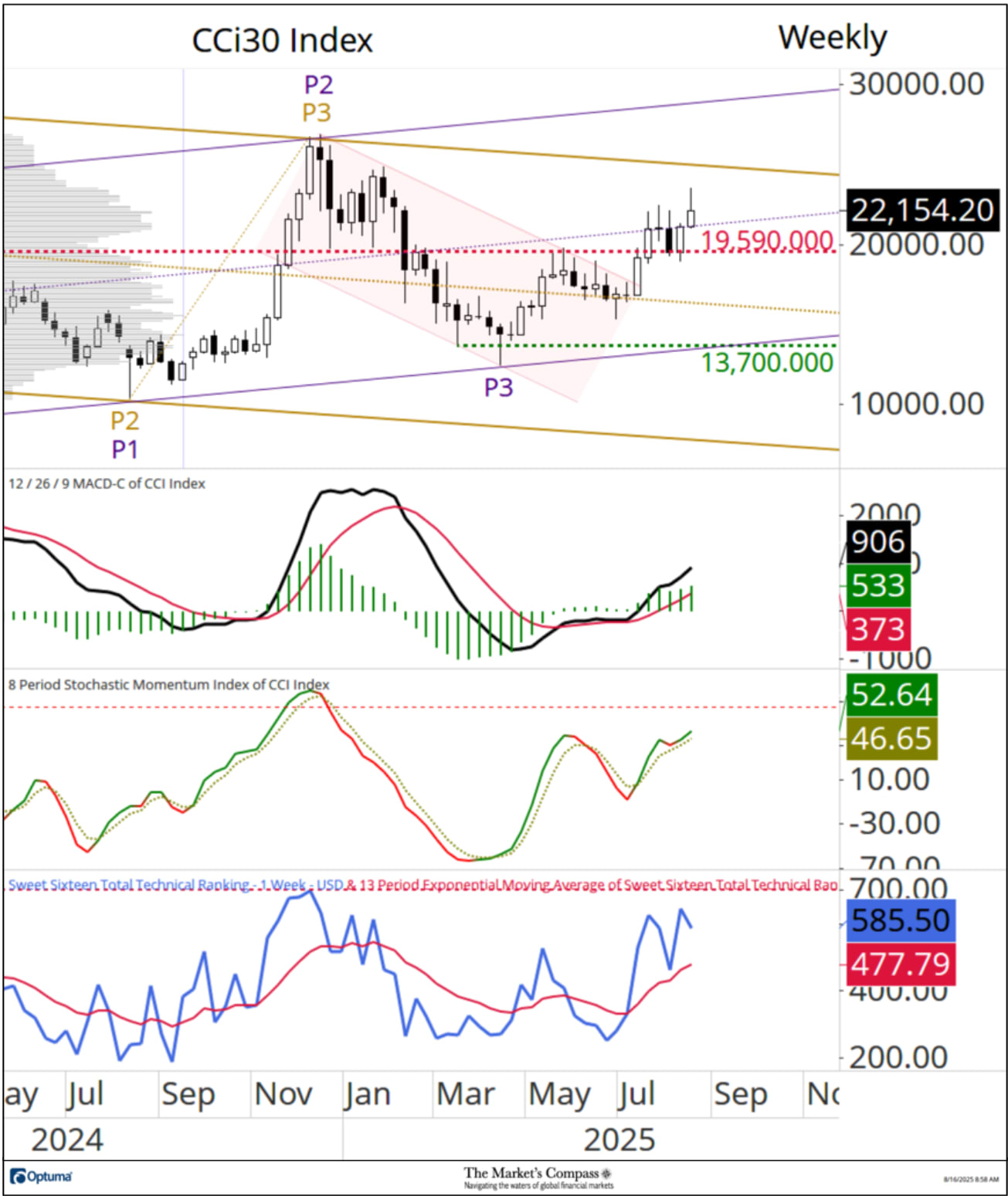 After struggling to overtake Median Line (violet dotted line) of the Schiff Modified Pitchfork (violet P1 through P3) for four weeks the CCi30 Index cleared that hurdle and held newly minted support there by the end of the week. MACD continues to climb higher above its signal line in positive territory and the shorter-term Stochastic Momentum Index held its signal line is tracking higher again. After seeing the mixed absolute gains and losses last week in the Sweet Sixteen, a pullback in the Total Technical Ranking is not a surprise. If the Index can hold tentative support at the Median Line, there is a better than even chance that it will easily challenge the Upper Parallel (solid gold line) of the longer-term Standard Pitchfork (gold P1 through P3). Key support remains at the 19,590 level.
