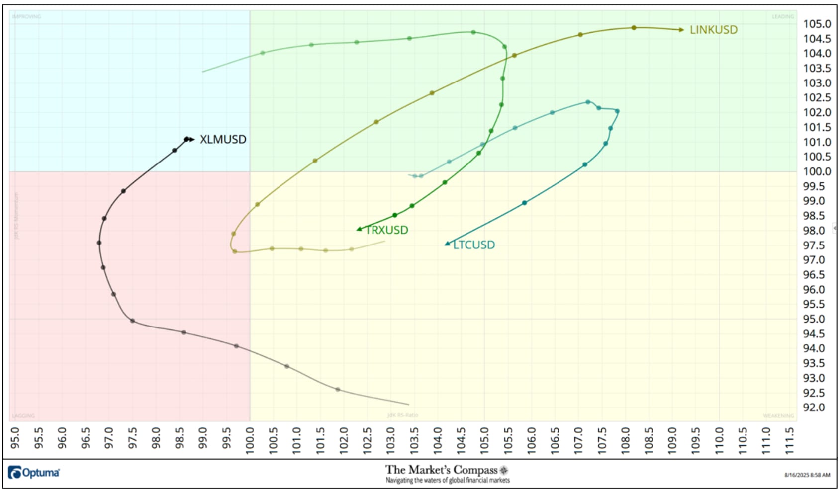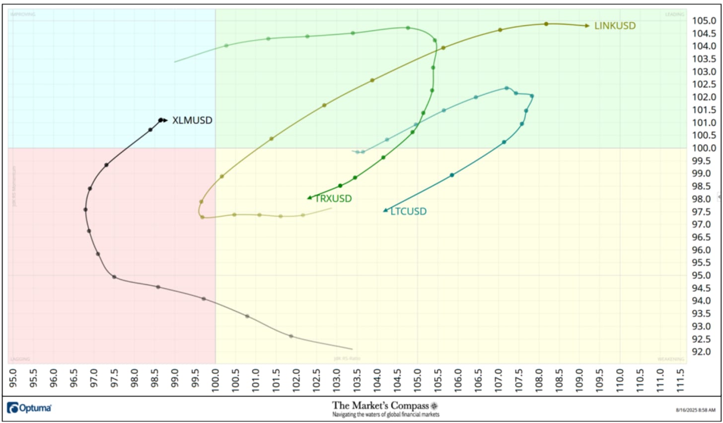 Both Litecoin (LTC) and Tron (TRX) began to lose Relative Strength and Relative Strength Momentum last weekend as they fell out of the Leading Quadrant and fell into the Weakening Quadrant. Stellar (XLM) has made a three-quadrant recovery by rising from the Weakening Quadrant through the Lagging Quadrant and just entered the Leading Quadrant. That said the positive Relative Strength Momentum began to slow at the end of last week. ChainLink (LINK) rose out of the Weakening Quadrant last weekend and rose sharply (note the distance between the daily nodes) in the Leading Quadrant as it displayed the best Relative Strength of the Sweet Sixteen.