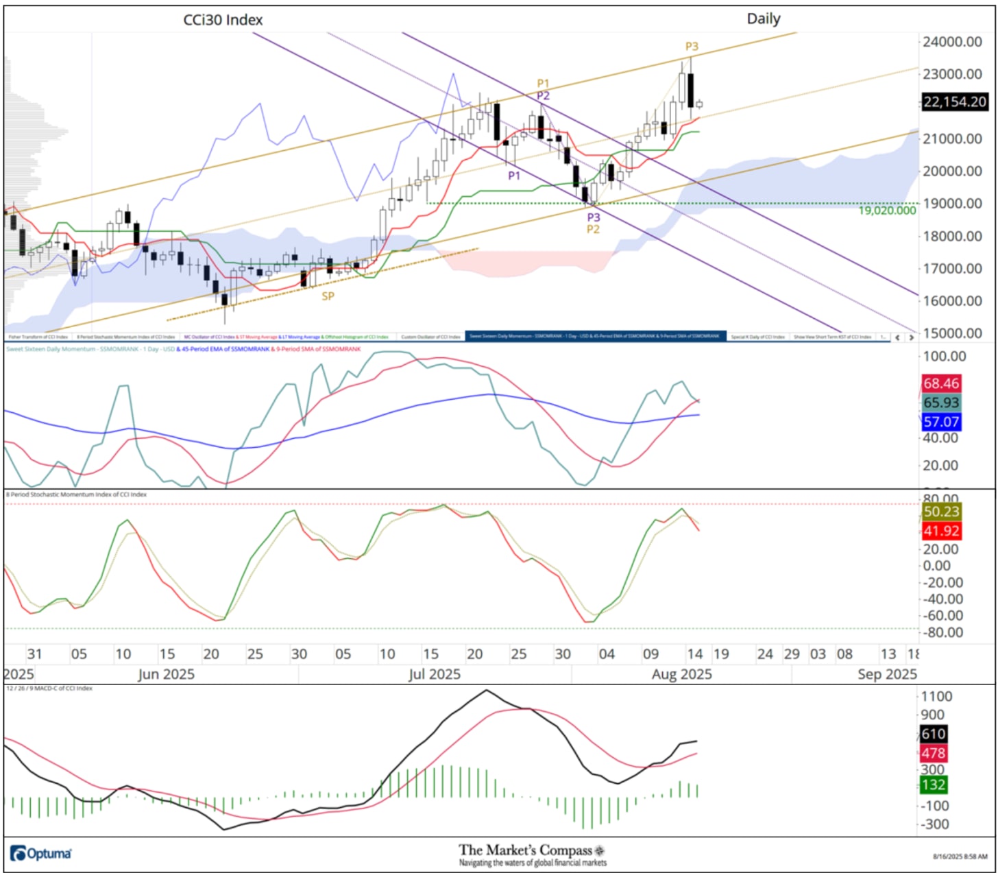 After the CCi30 Index overtook the Upper Parallel (solid violet line) of the Schiff Modified Pitchfork (violet P1 through P3) a brief period of backing and filling unfolded until early last week. On Wednesday the broad-based index rallied and closed at a new daily closing high. On Thursday a sharp reversal unfolded leading me to draw a new shorter-term Schiff Pitchfork from the intra-day high. I chose that variation of pitchfork after a lookback to June and July when on a closing basis, prices held a sliding parallel (gold SP) that was at the same vector of the new pitchfork. Thursday’s reversal bounced off the Median Line (gold dotted line) and the Tenkan Plot (red line). The Sweet Sixteen Daily Momentum / Breadth Oscillator has edged below the shorter-term moving average (red line) but it remains above the longer-term 45-day exponential moving average. It’s surprising that the Stochastic Momentum Index has fallen from being overbought during Thursday’s price weakness but MCD to still tracking quietly higher above its signal in positive territory. Holding Median Line support and the Kijun Plot (green line) is key to any bullish argument.