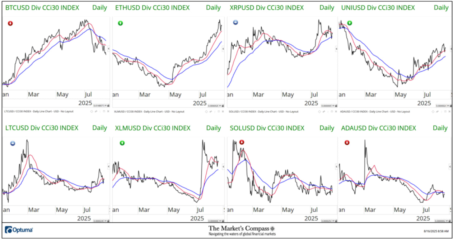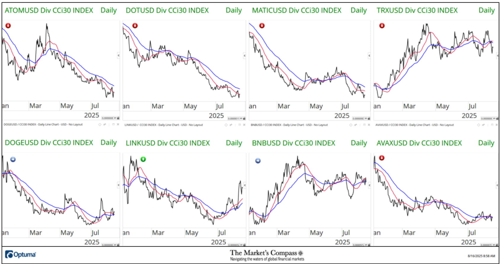 The two panels below contain longer term line charts of the Relative Strength or Weakness of the Sweet Sixteen Crypto Currencies vs. the CCi30 Index that are charted with a 55-Day Exponential Moving Average in blue and a 21-Day Simple Moving Average in red. Trend direction and crossovers, above or below the longer-term moving average, reveals potential continuation of trend or reversals in Relative Strength or Weakness.