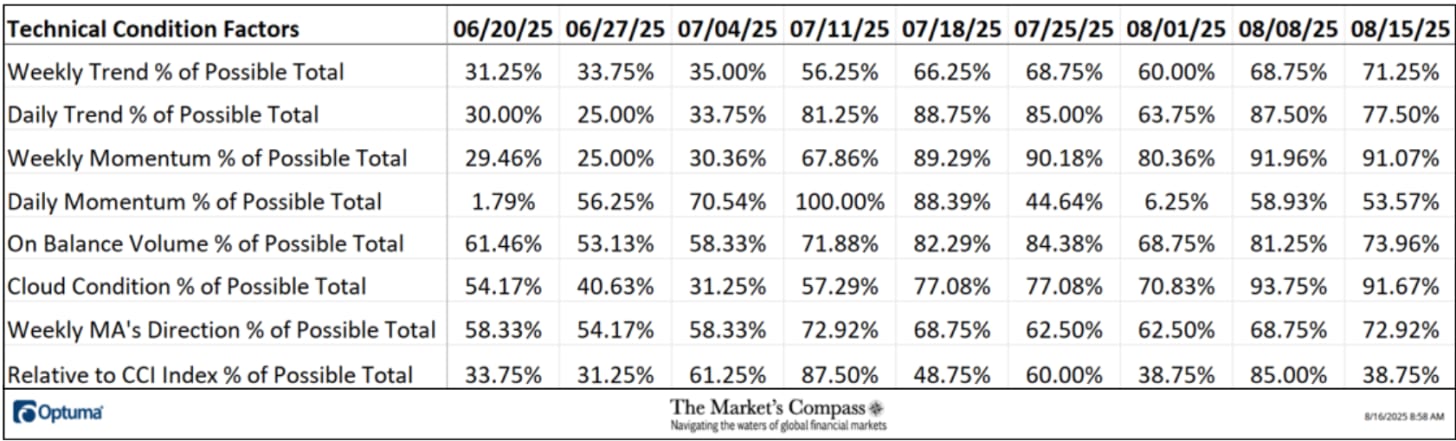 The Daily Momentum Technical Condition Factor or “DMTCF” fell back slightly to 53.57% or 60 out of a possible 112 last week from the reading of 58.93% or 66 the previous week.