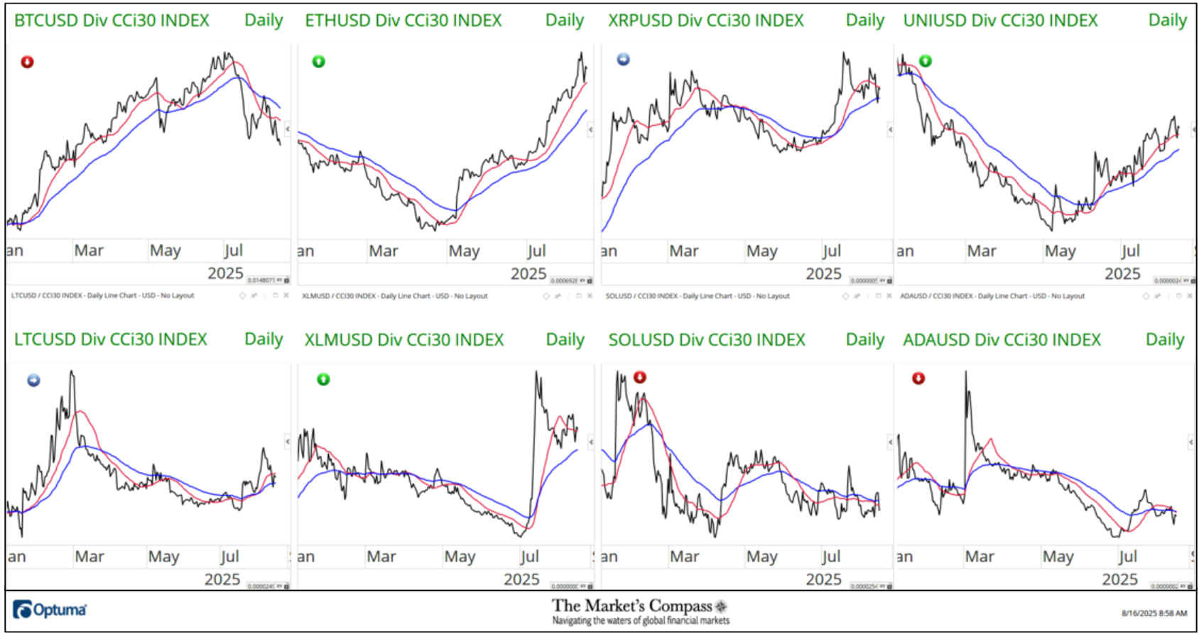 For a explanation on how to interpret the Sweet Sixteen Total Technical Ranking or “SSTTR” vs the weekly price chart of the CCi30 Index in the lower panel, go to www.themarketscompass.com. Then go to the MC’s Technical Indicators and select Crypto Sweet 16. A brief explanation follows…