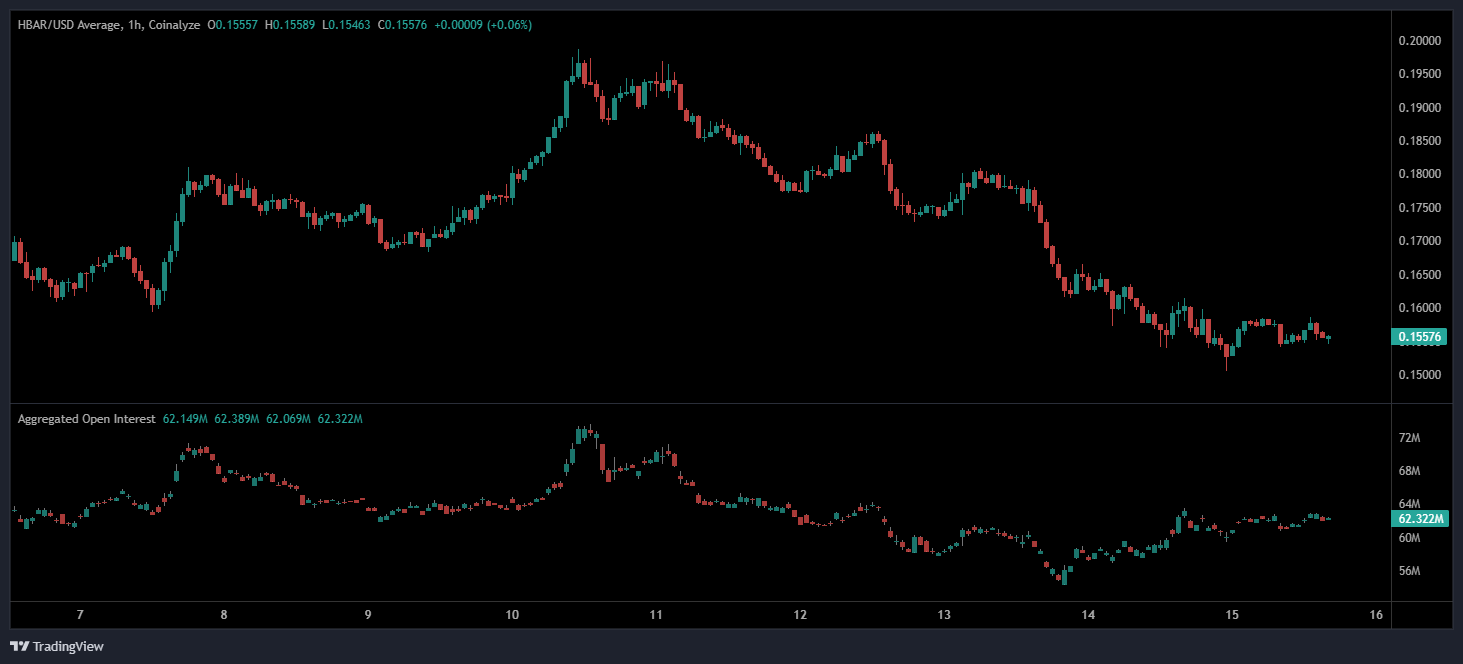 The HBAR/USD 1-hour chart from Coinalyze shows price trading around 0.15631 following sustained downward pressure after peaking near 0.20000. Over recent sessions, the price has formed lower highs and lower lows, confirming a well-defined bearish sequence. Stabilization has emerged near 0.15500–0.16000, showing a temporary pause rather than a structural recovery, with the price continuing to hover close to local lows.