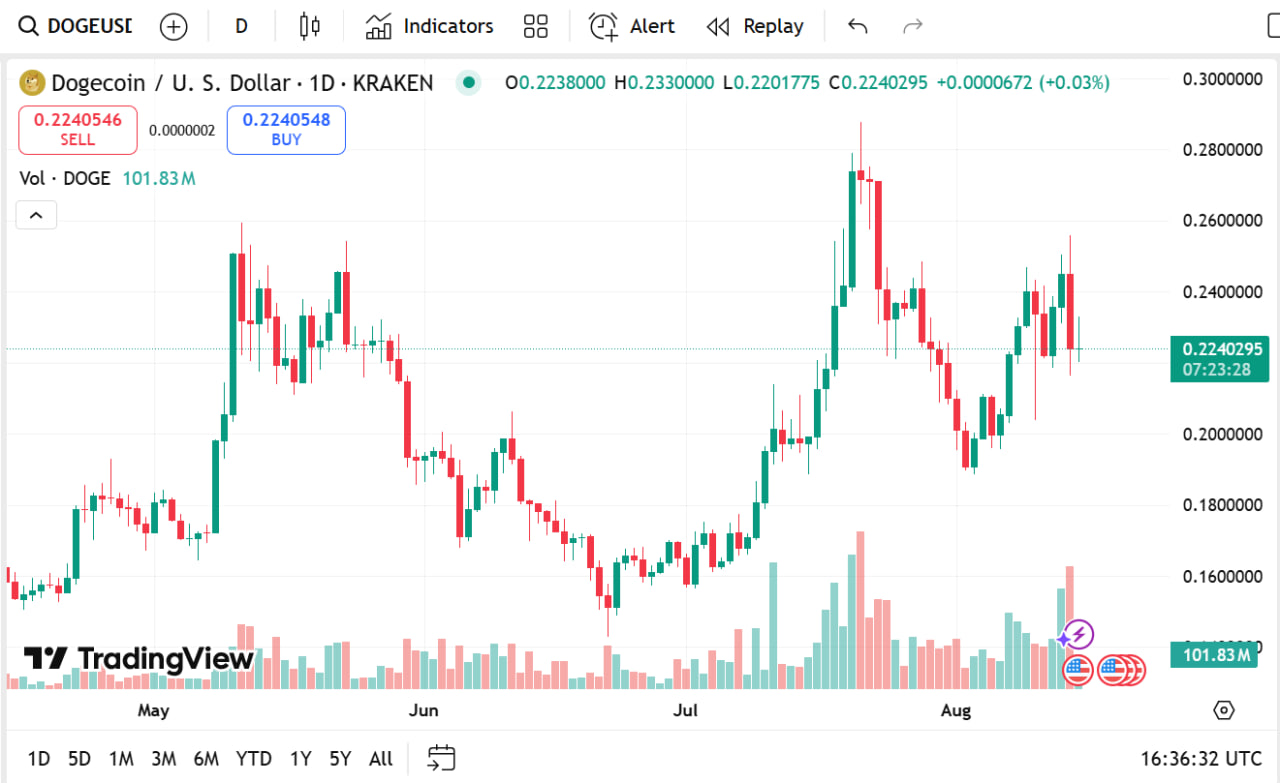 Dogecoin is trading at $0.2242, losing 1.1% in the last 24 hours, with a market cap of $33.75 billion and daily volume of $3.54 billion, a decline of 27.89% from yesterday.