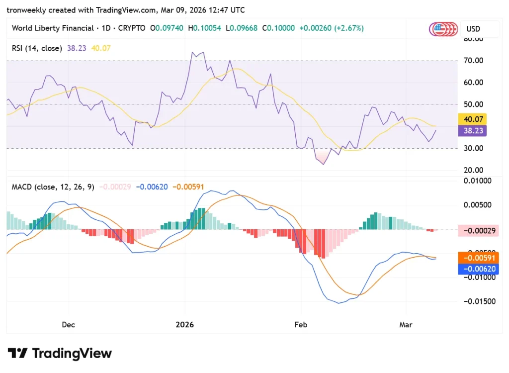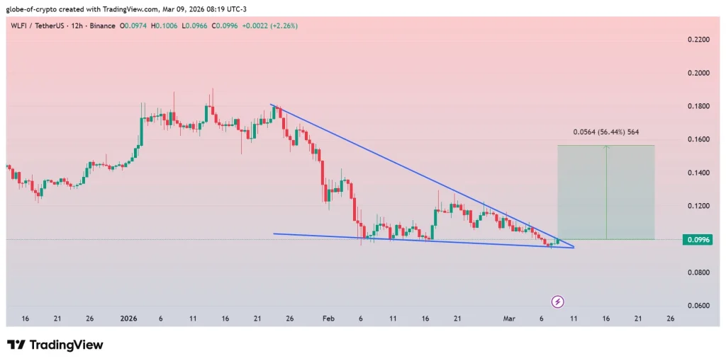 World Liberty Financial (WLFI) is testing resistance near a descending triangle on the 12-hour chart. As of March 9, 2026, the token trades at $0.09992, up 2.29% over the past 24 hours, showing positive momentum.