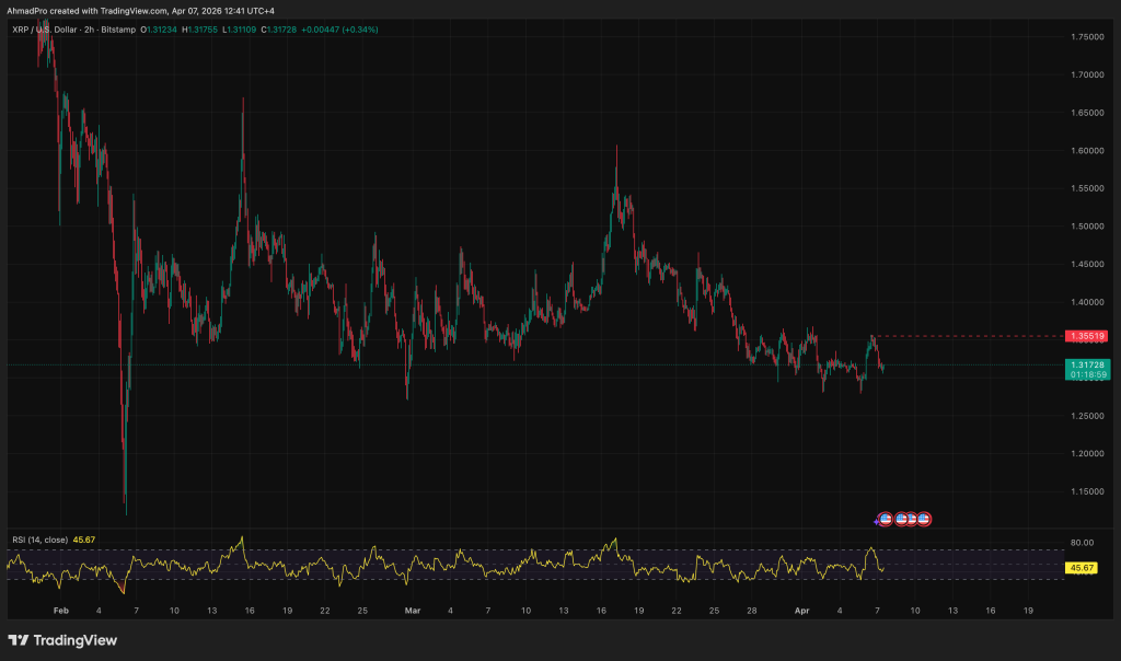The failed push came off a March 31 high of $1.37, with XRP unable to clear $1.40 resistance and grinding lower through a $1.28–$1.33 range ever since.