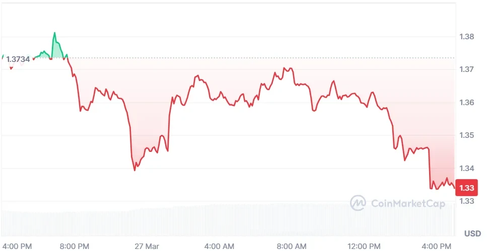 As of writing, on Saturday, March 28th, XRP is trading at $1.33, representing a 2.69% decline in the last 24 hours. However, the trading volume has increased by 31.52% and is currently standing at $2.42 billion. Over the last week, the price of the token has declined by 7.88%, according to CoinMarketCap.