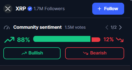 according to the data curated from CoinMarketCap, the community is still bullish on the coin. Even though XRP lost its third position, investors and traders have a strong belief in its strength. Out of 1.7 million votes, 88% of people are optimistic about the coin, showing their ever-enduring trust in XRP.