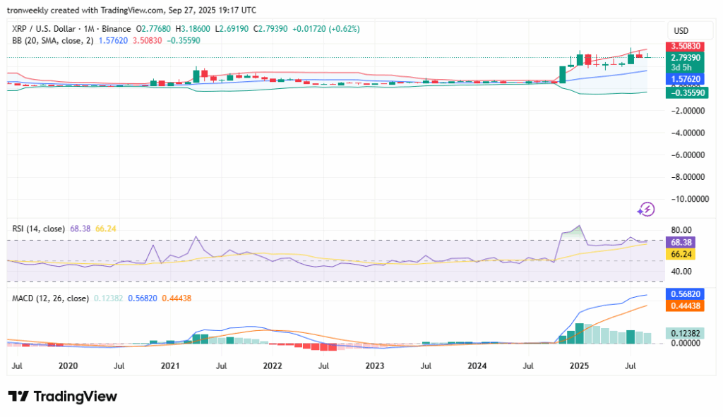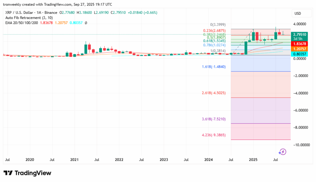 XRP is consolidating on its monthly chart after a strong rally that started early in 2025. As of September 27, the token trades at $2.79, within a range of $2.69 to $3.18. The $2.69 zone has become a vital defense point, aligning with the 0.236 Fibonacci retracement.
