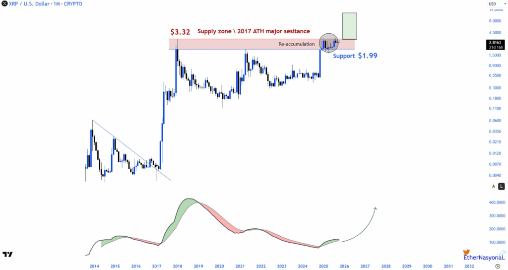 Another view put out by EtherNasyonal frames XRP’s anointing over the past few years as one of re-accumulation. The $3.32 area, the acting 2017 peak, has re-emerged as the big resistance. Though staying above $1.99 on the monthly chart favors the argument for the structural bullish reversal.