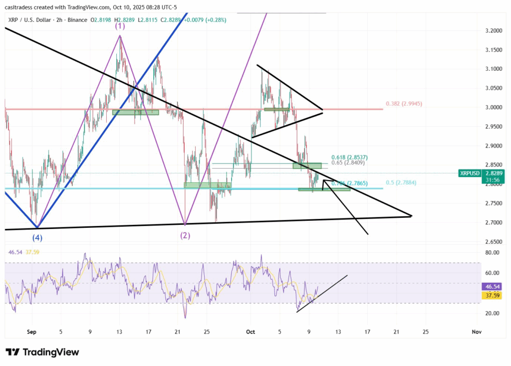 This consolidation has been unfolding since July, with XRP now pressing against a descending trendline near $2.83. The narrowing range between these levels reflects mounting pressure that often leads to sharp movements. According to chart watchers like CasiTrades, a clean break above $2.83 could push XRP toward the psychological $3 mark, which might then set the stage for a larger upward wave.
